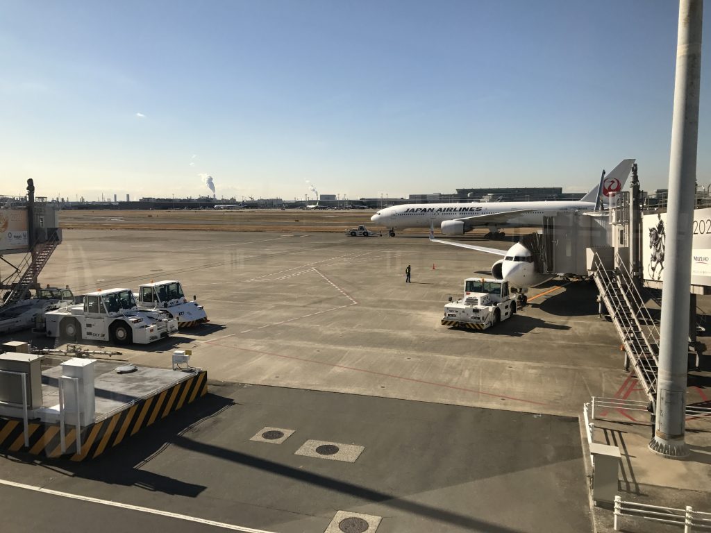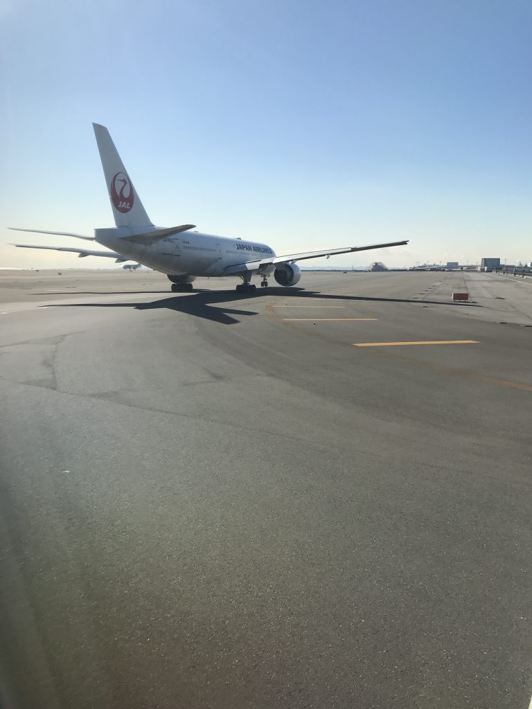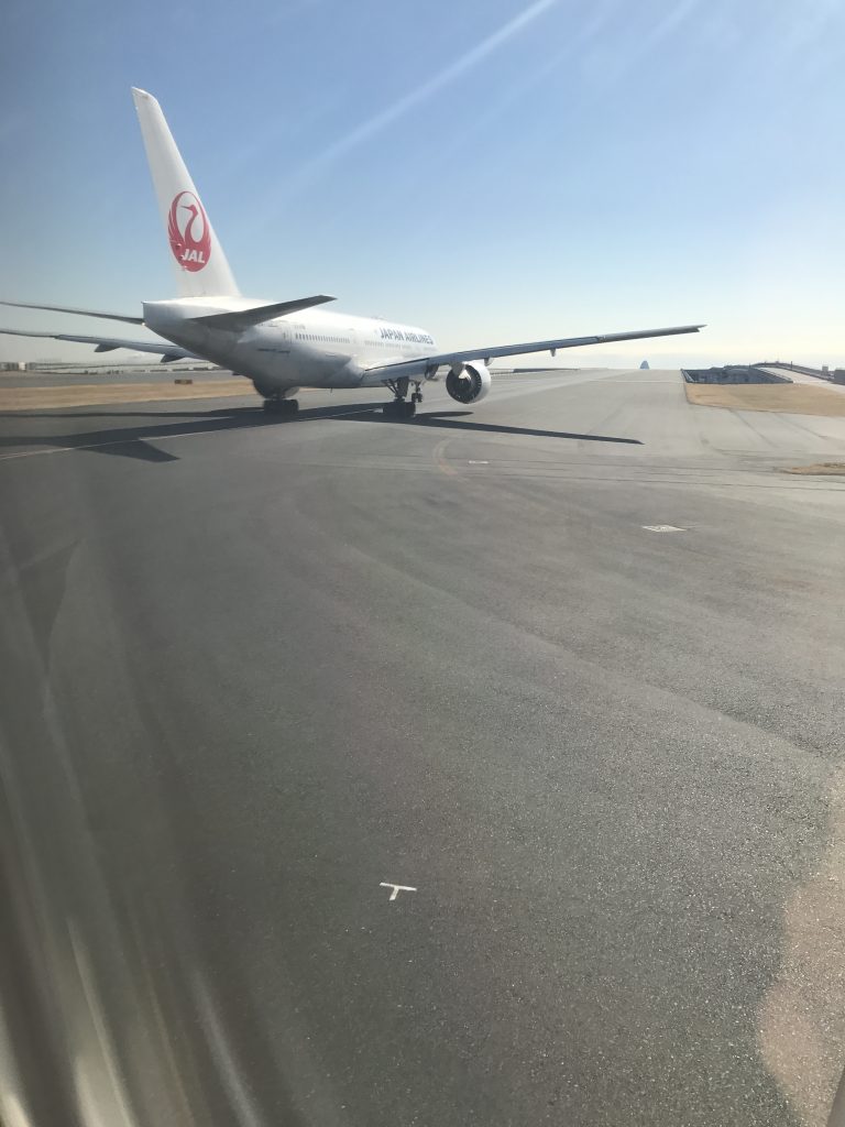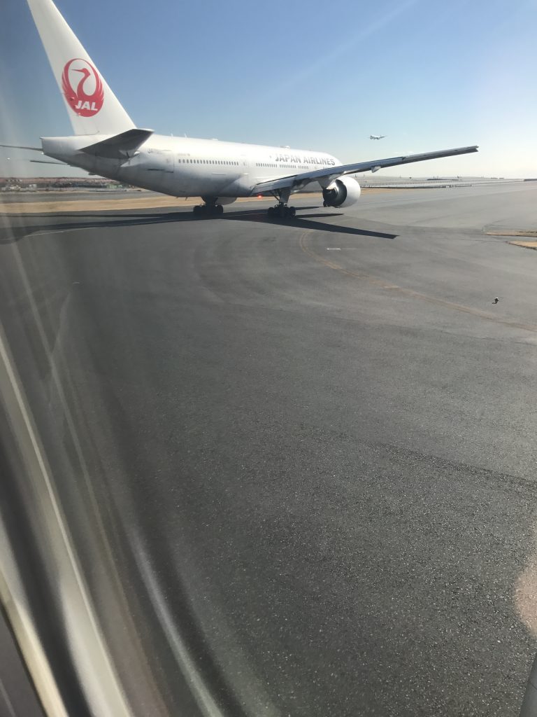 今回は羽田空港のD滑走路から離陸する様です。前方にJALのB777の機体が見えてきました。