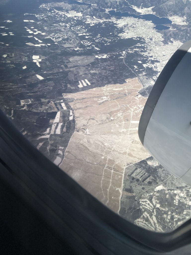 そうこうしているうちに丹沢や大月、甲府盆地が見えてきました。どうやら南アルプス方面を飛行してダイレクトに神戸へ向かうようです。下の写真の中段右奥に見えているのが横田基地です。