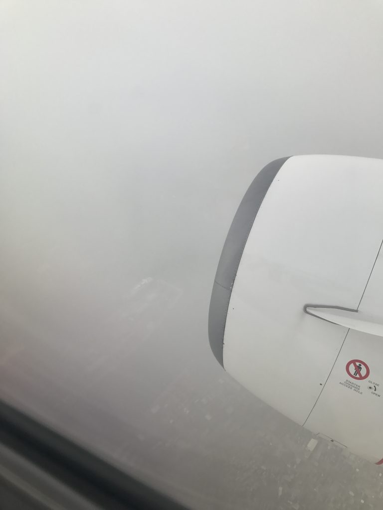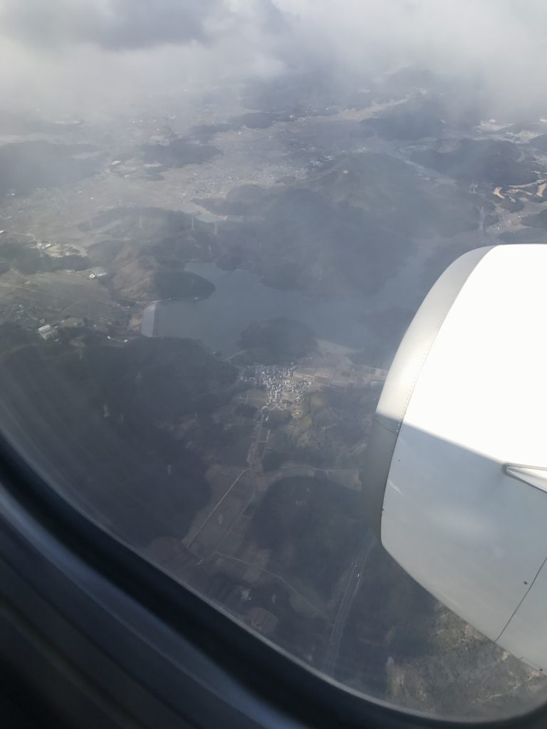 着陸に向けて、降下が始まりました。どこかの湖が見えますが、雲に入ったり出たりでほとんど場所が分からなくなりました。